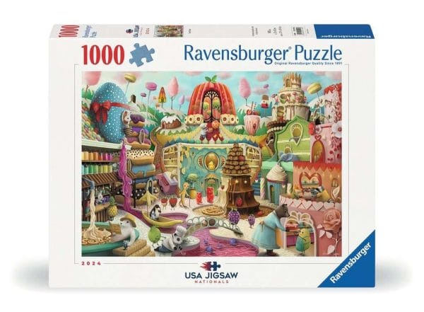 Like the polar bear enjoying a relaxing soak in a cocoa hot tub, you’re sure to enjoy a sweet escape into a confectionary wonderland with our “Sweet Street” jigsaw puzzle! Artist Demelsa Haughton has once again created a fantastical world for your puzzle enjoyment, complete with strawberries going for a dip, donut and popsicle homes, and trees topped with macarons and cotton candy. This charming scene was completed in the Pairs Finals at the 2024 USA Jigsaw Nationals speed-puzzling competition!