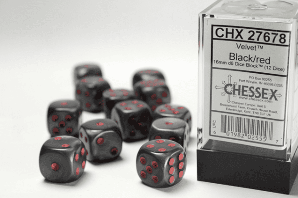 12d6 Dice Block (16mm): Velvet (Assorted Colours) Black w/ Red