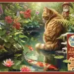A pond filled with gorgeous Koi fish swim past the lotus flowers as they circle the cat sitting on a stone. A luscious garden with flowering plants is home to the frogs, birds, and fluttering flies of all kind. It’s a serene place to reflect and relax while thinking of all that is good in this world.