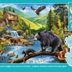The Family Pieces puzzle is all about family. In this peaceful summer glen the bunnies, raccoons, deer and butterflies enjoy the fresh air together. The creaking of an old watermill doesn’t disturb the peace as the animal families gather for refreshment. Based in Slovakia, artist Eva Nikolskaia has illustrated many fantasy and romance book covers as well as many popular puzzles including Cobble Hill’s “Red-Roofed Cabin” image.