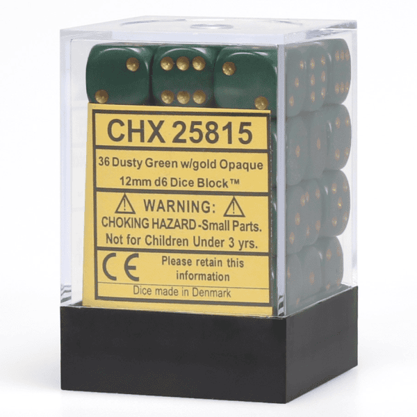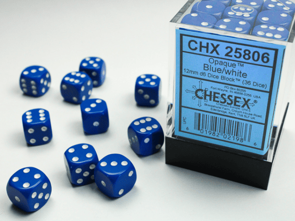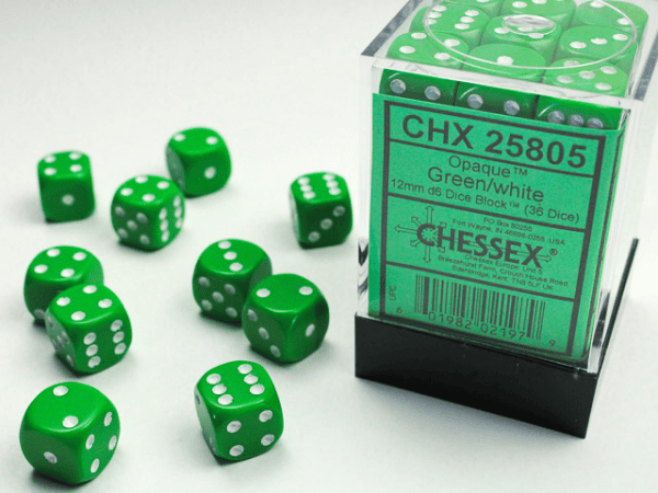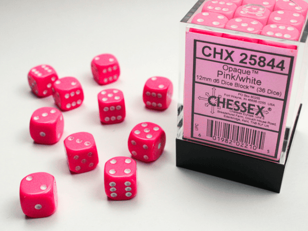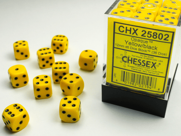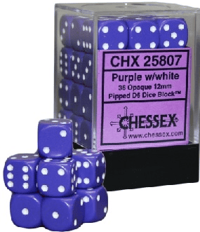 Block of 36 6-sided 12mm Dice with a easy to store container. Comes in various colors and hues! Add a splash of custom color to your game!