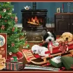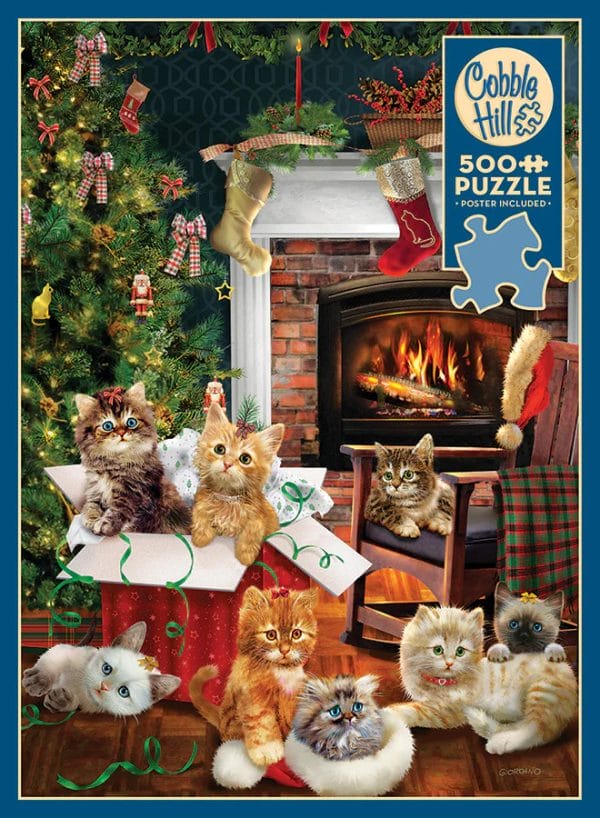 Christmas Kittens is full of cuteness. Adorable feline friends are enjoying the aftermath of opening presents on Christmas day. A decorated tree has managed to stay adorned with ornaments, while stockings hang from the mantle. A couple of cuties have made their way into a box, as cats often do. While the other kitties lay about on the floor and chair warmed by the crackling fireplace. Robert Giordano has created several puzzles for Cobble Hill that celebrate our love of cats and dogs.