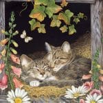 Cuddling kitten Sisters, nestled in the hay bed hidden behind cockle shells and daisies.A loving 500 piece cat puzzle.
