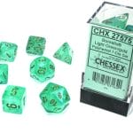This is a 7-Dice Set of Chessex’s Borealis Light Green/Gold with Luminary. This set replaces the previous version of the Borealis Light Green/Gold because now, all newly-released Borealis dice will contain Chessex’s Luminary glow in the dark glitter.