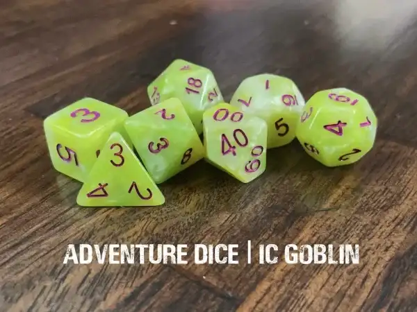 IC Goblin RPG dice set are a shimmery swirl of green with purple numbering.