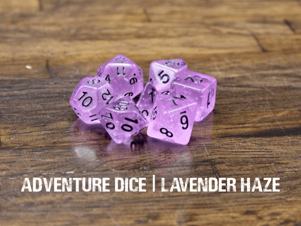Lavender Haze RPG dice set are translucent purple with white speckles and black numbers. The speckles glow in the dark!