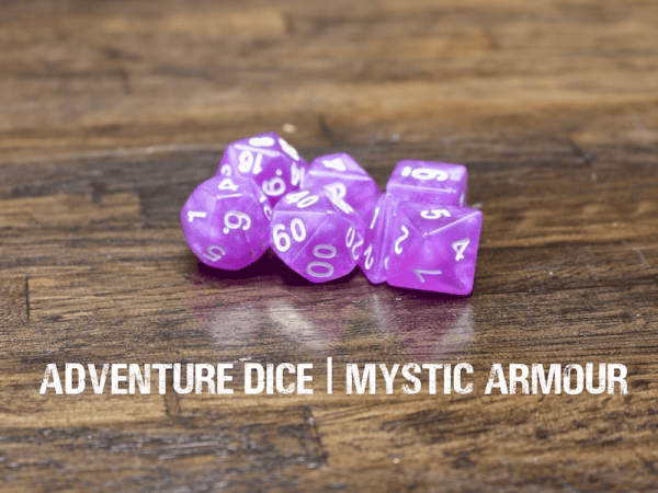 Mystic Armour dice set are translucent sparkly purple with white numbers.