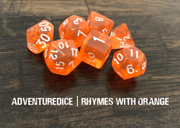 Rhymes with Orange RPG dice set are transparent orange with white numbering.
