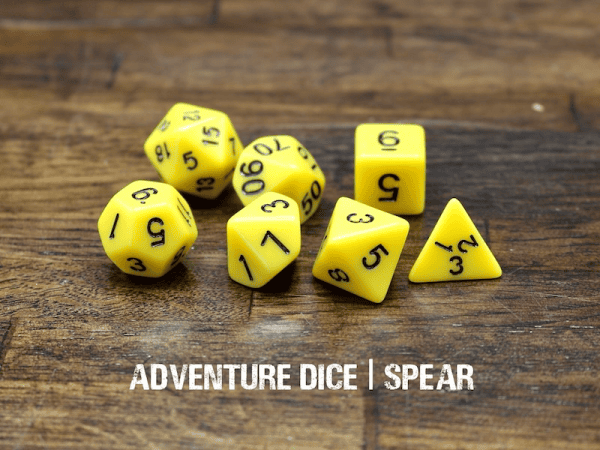 Spear dice set are opaque yellow with black numbers.
