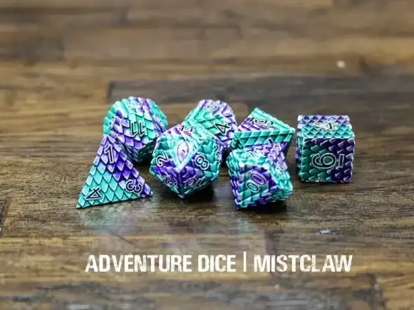 Mistclaw metal dice set are silver metal in a dragon scale pattern, patined teal and purple, with black numbers. The d20 features a purple dragon’s eye on the 20.