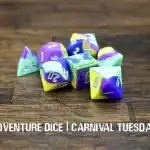Carnival Tuesday silicone dice set is an opaque swirl of yellow, blue, purple, and mint green, with silver numbers.