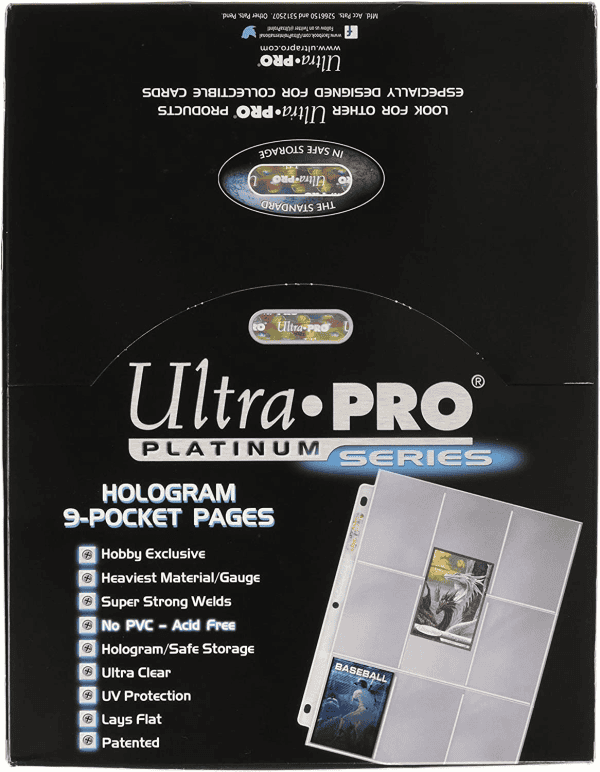 Protect and showcase your trading cards, postcards, memorabilia photos, and documents with the highest standard in safe storage – Ultra PRO’s Platinum Series Pocketed Pages. The Platinum Series pages are produced with Ultra Pro’s highest thickness, ultra-clear, non-PVC, and archival-safe polypropylene film, and sealed with solid bar seals for superior seal strength and improved lay-flat qualities.