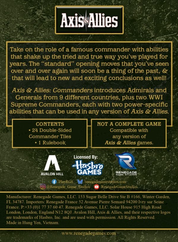 Axis & Allies: Commanders introduces Admirals and Generals from 9 different countries, plus two WWI Supreme Commanders, each with power-specific abilities that can be used in any version of Axis & Allies. This accessory features all-new artwork of every commander!