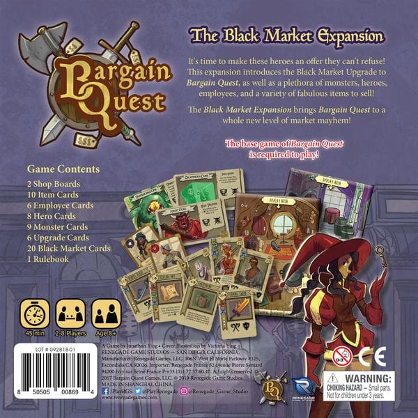 The Black Market Expansion brings Bargain Quest to the seedy criminal underworld. With new heroes like the Shaman, and the Bravo, along with cunning employees like the Loan Shark and the Henchman. It’s a dangerous town, and you’ll have to use all of your cunning and wits if you mean to make a profit out here!