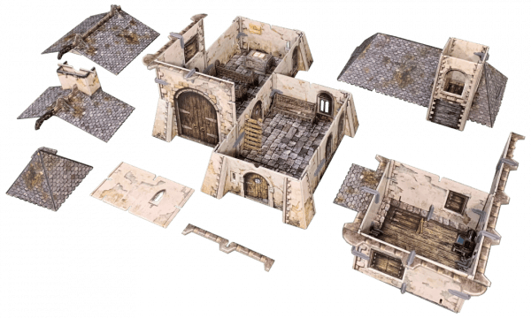 The terrain is supplied flat-packed on high-quality, high-density card, printed in full colour on both sides, so no painting required! The terrain requires assembly, and some smaller parts will require glue.
