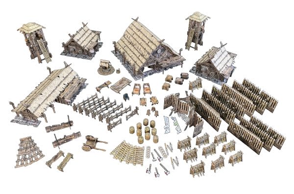 This box contains all the terrain you need for a complete gaming table set in a wooden settlement out on the plains, suitable for many 28-35mm fantasy and historical games. You can build a tightly packed settlement on a small skirmish board or spread the pieces out over a larger table. Many of the pieces are modular and can be assembled in any combination you choose for a different set-up every time. The roofs are removable and the buildings have fully detailed interiors.