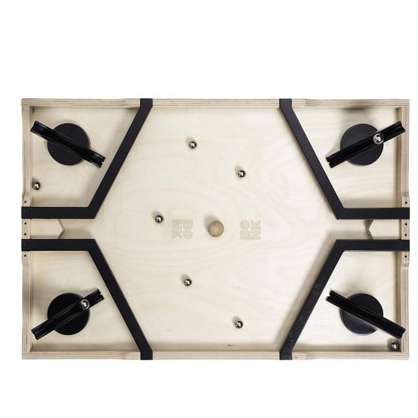 If you run out of steel balls, then you’re at the opponents’ mercy until they shoot, which will likely land a steel ball on your side of the board. If you knock the wooden ball into the opponents’ goal, you score a point, then the next round begins with the steel balls remaining on the half of the board where they’re currently located. The first team to score five points wins! BONK features the same gameplay as Rollet but the games have important differences that affect play (and their prices): The BONK game board is smaller, so gameplay tends to be faster.