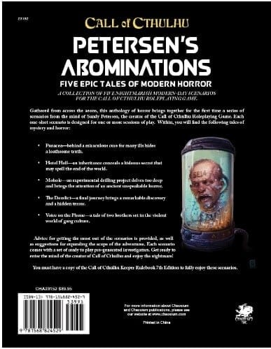 Gathered from across the aeons, this anthology of horror brings together for the first time a series of scenarios from the mind of Sandy Petersen, the creator of the Call of Cthulhu Roleplaying Game. Each one-shot scenario is designed for one or more sessions of play.