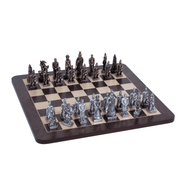 Under the influence of the reformer Shang Yang, China was united for the first time under a system that centralized power, established military prowess, increased trade, exalted the rule of law, and decreased the power of the nobility. During the Qin dynasty the Great Wall of China was built and it is said modern China derives its name from this first dynasty. That world comes alive in our magnificent pewter Chinese Qin Chessmen. Emperors, Concubines, Warriors, and of course, The Great Wall are represented in great detail. It’s truly a stunning set that you will want to display in a place of prominence. The chessmen come with a beautiful 16 inch Walnut Root Chessboard with rounded corners.