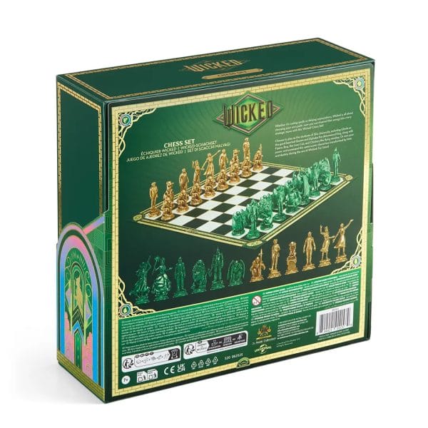 This set features two sets of pieces in vibrant metallic emerald and gold, with a matching board and box bordered with bricks from the Yellow Brick Road.