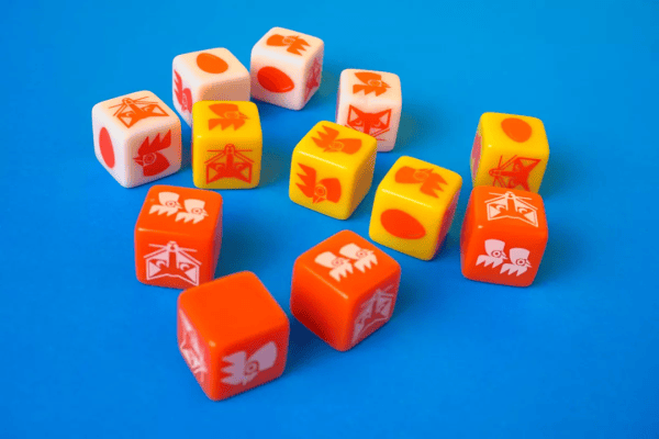 For each Egg symbol rolled, a die is hatched from the Coop and then the active player will choose to reroll all of their blanks, eggs, and newly hatched dice, or they may score their points and pass the dice to the next player. If a player chooses to “Chicken Out” at the start of their turn, they lose a point for being a chicken, but they get to place all Yellow and Orange dice back into the Coop.