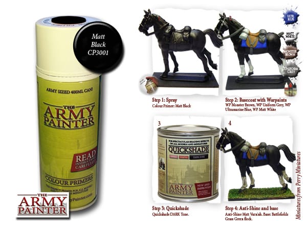 An ingenious combination of Primer and Colour Spray in one. The Colour Primers unique formula has been designed to be used on all metal, plastic and resin miniatures and leaves a perfect finish. The extra-fine pigment and special nozzle combination makes the Colour Primers easily cover the first time. The colours are matte, making your freshly sprayed miniatures or models ready for basecoat almost right away.