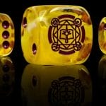 These contain a mix of magenta hues swirled millennia old greys and inlaid with an easily readable mustard pip; resin 16mm dice. The symbols are on the ONE side. Yes, the ONE side.