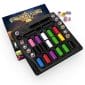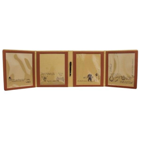 Open this “well-worn” spell book screen to find even more detail inside: Caleb’s notes, stories, spells, and doodles are scribbled within the bottom interior of each of the four gusseted pocket pages, with secret hidden messages from Jester scattered around the edges in invisible ink that can only be revealed with the right light! Each screen includes four unique pages of static-cling reusable stickers to help you organize your sessions, with character stickers of officially licensed Mighty Nein artwork.