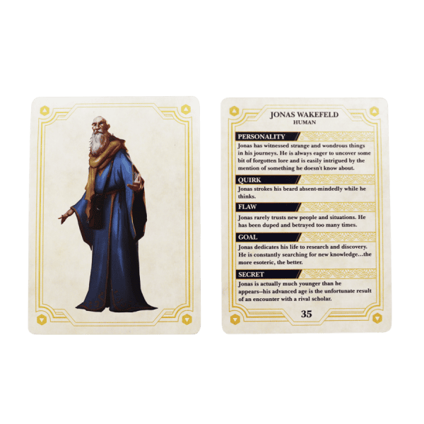 Each NPC card contains a collection of traits that help you role-play that character in your game. The following is included on every NPC card: