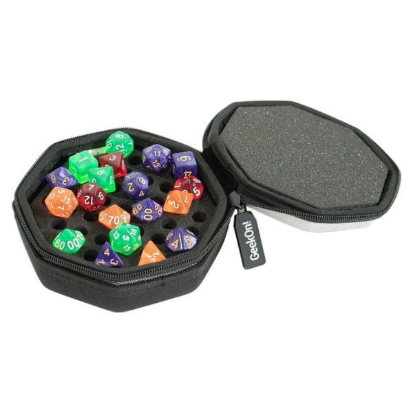 Dice aren’t meant to touch tables or the carpet you walk on with your sweaty bare feet! They are meant to touch velvet; Velvet that’s included in our GeekOn dice trays. Our dice case holds up to 30 dice, featuring waffle foam to protect your dice!