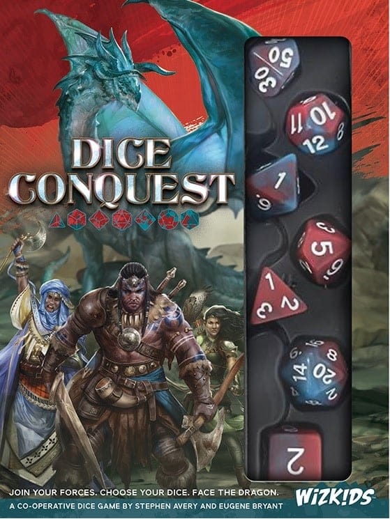 Dice Conquest is designed by Stephen Avery and Eugene Bryant, and features illustrations by Mirco Paganessi. It includes a beautiful set of 7 polyhedral dice, but players are also free to swap in their favorite set of dice instead!