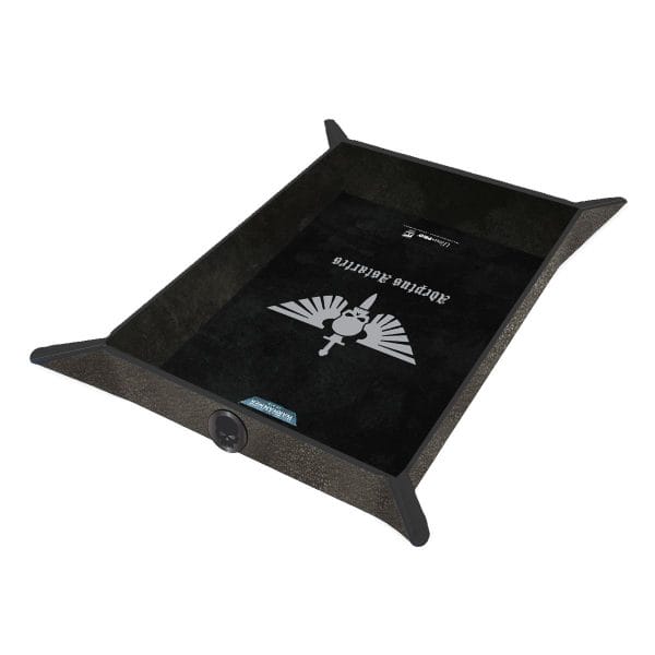 This Space Marines Folding Dice Tray offers a safe space for rolling your RPG dice when commanding your armies. Using the small magnets inside each corner, you can easily create an instant dice rolling area in seconds: simply pop up the side walls and you’re ready to roll! No bulky clasps or snaps needed. The reversible design features a textured leatherette with Adeptus Astartes symbol on one side, and a gold foil Space Marine and faction emblem on the other. Sized no bigger than a sheet of paper (8.5 in. x 11 in.) when folded flat, you can easily take your dice rolling tray with you on the go inside your Datasheet Folio or Codex Book Folio.