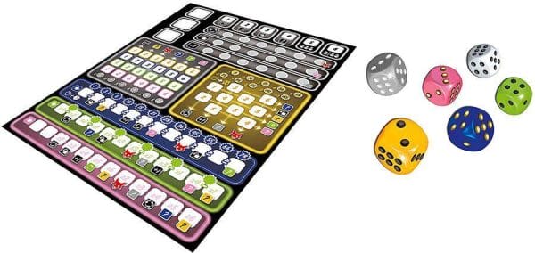 Doppelt So Clever follows the model of 2018’s Ganz Schön Clever. Each turn the active player rolls six dice, chooses one of them to mark off a space on their scoring grid, places any dice with lower numbers on the side, then re-rolls any remaining dice. The white die is a joker and can be used as any one of the other five colors. After the active player chooses at most three dice, then the other players chooses one of the set-aside dice for use on their scoring sheet. It has five new dice-marking challenges and a new action beyond the re-roll and “use one more die” actions of the earlier game.