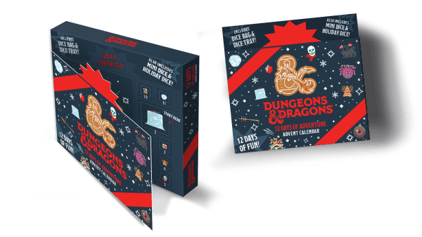 Countdown the 12 days to Christmas with the official D&D advent dice calendar that includes a dice tray, a custom D&D inclusion dice set, a D&D mini dice set, an exclusive Beholder inclusion d20, a dice bag to carry your loot, and more!