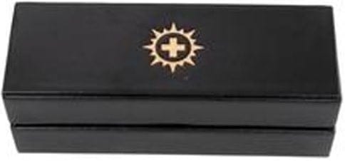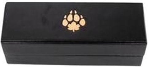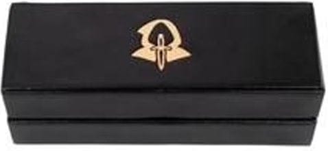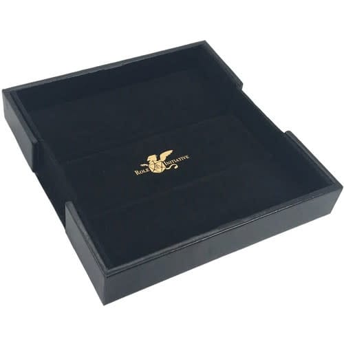 Three separate compartments hold up to 30 dice and/or 3 minis. Gold foil logos on both interior and exterior (Wizard) give it a touch of class. Convert between storage box and rolling tray in a snap. Magnets ensure the box stays closed during transport and remains open in the tray configuration for rolling dice. Packaging features a cardboard sleeve with a hang tab.