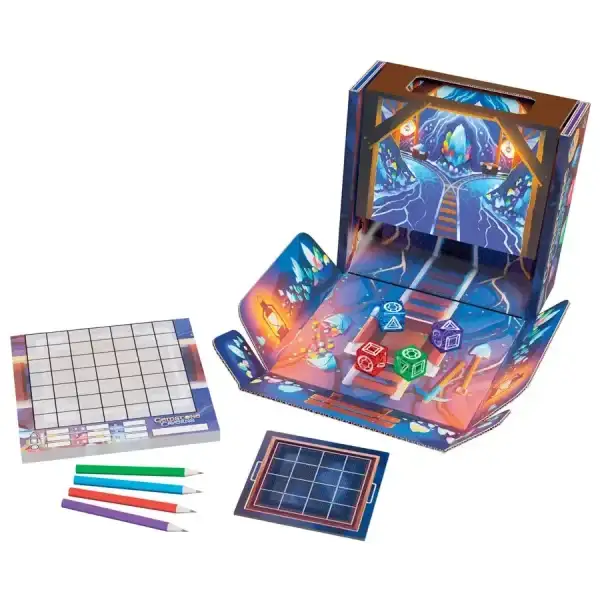 In this puzzle-y dice game you’ll play as miners in the depths of Gemstone Caverns, rolling the gem dice to determine which jewels you’ll collect and sell for profit at the local Gem Market! The most strategic miner will end the game with a beautiful cart full of groups of 5 or more of each gem shape to sell to the finicky Gem Buyer.