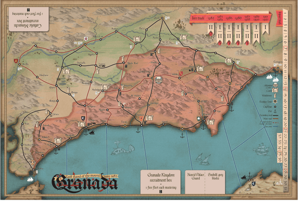 The map is point-to-point, covering the ancient Nasrid Kingdom in southeast Iberia (present-day Spain). Granada, the capital, is the jewel of the realm: the game ends if it falls into the Catholic player’s hands.