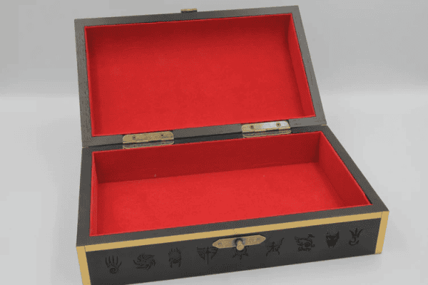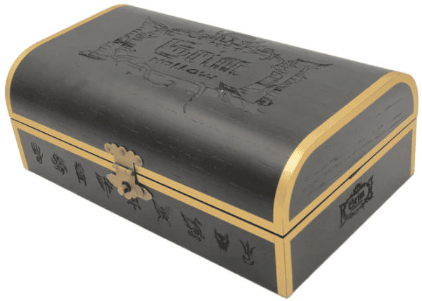 Featuring engraving of the infamous Grim Hollow class symbols, with a bright and vibrant red velour inside, creating a plush rolling surface for your dice.