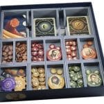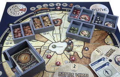 Insert compatible with Dune®, and the Ixians & Tleilaxu® expansion. The design provides both efficient storage and improved game play. Many of the trays can be utilised during the game, and they greatly aid set-up and clear-away times. The rules and boards act as a lid on top of the trays.