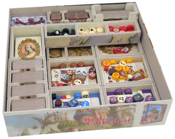 All the trays have colour icons added to the tray bottom to make it easy to know what goes where when clearing the game away. The main card tray and the royal court & city tiles tray can be placed directly onto the game board, and their colour print allows them to integrate with the print of the board.
