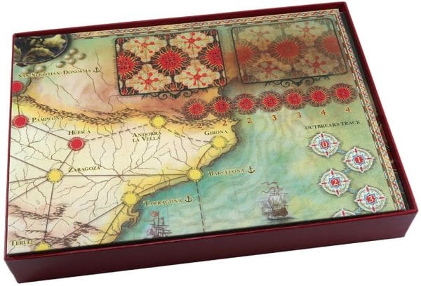 Insert compatible with Pandemic: Iberia®, or separately compatible with Pandemic: Rising Tide® or Pandemic: Fall of Rome®. The design provides both efficient storage and improved game play. The trays can be utilized during the game, and they greatly aid set-up and clear-away times. The rules and boards act as a lid on top of the trays.