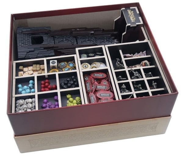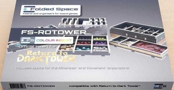 The filler tray has a colour design matching the dark tower from the game box, and is even cut in such a way as to mimic the profile of the tower itself.