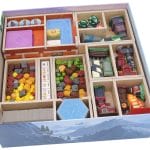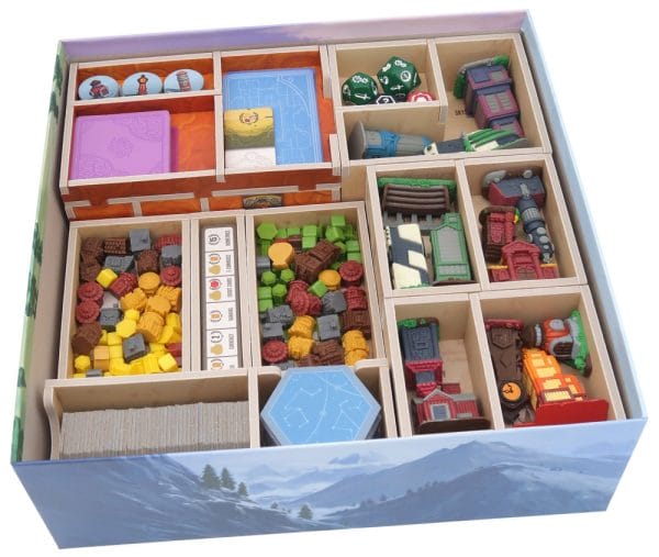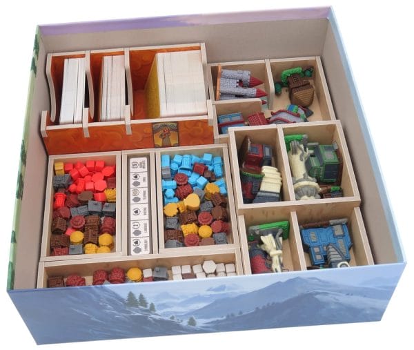 The images show the trays without the game components inside so that you can see the colour print designs. Every tray includes images from the rulebook or game cards and boards. The player trays have a colour terrain theme on the outside to match the player pieces inside.