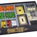 There is one large tray for coins, with separate slots for the 5 value coins. The main card trays have three slots each, one for each of the card types. the empty slots shown at the back of the trays are for the visitor cards from the Visit from the Rhine Valley® expansion. All cards can be sleeved.