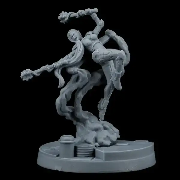 Nephenee’s playstyle on the battleground is one of hit and run. She is extremely agile having both the fly, dash, and nimble abilities which allows her to charge nearly any model at will. Once in combat she unleashes a flurry of attacks with her dual wield laser blades. She can also curse enemies and then obliterate her weakened foe in a storm of lasers. A deadly assassin type hero, she hits fast and hard!