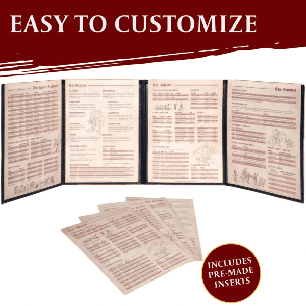 - Customizable Storage: Includes four transparent pockets with premade inserts, adaptable for your A4-sized campaign notes, maps, or monster details.