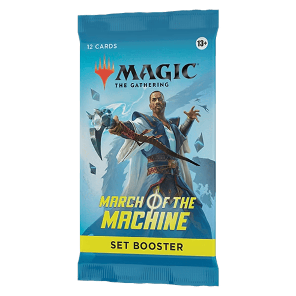 Each March of the Machine Set Booster contains 12 Magic cards, 1 Art Card, and 1 token/ad card, Helper card, or card from “The List” (a special card from Magic’s history—found in 25% of packs).