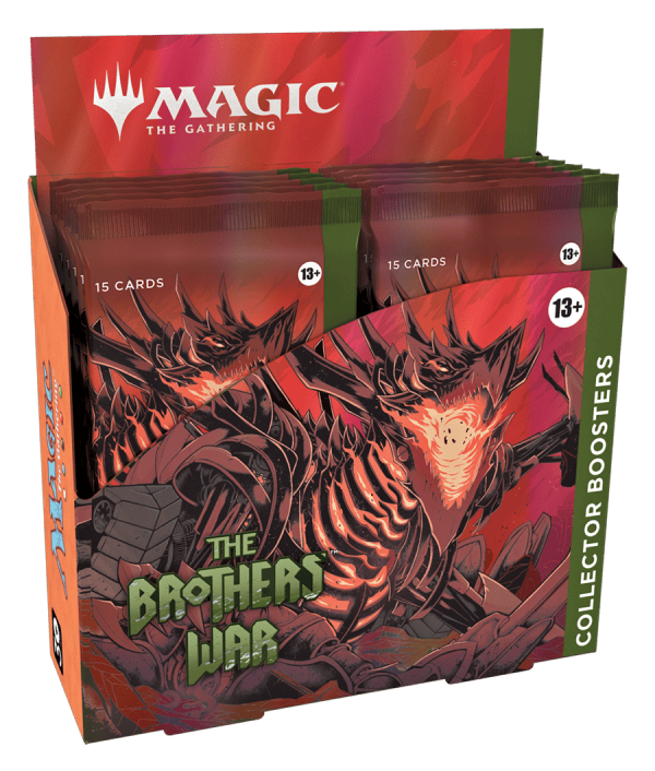 The Brothers’ War Collector Booster Box contains 12 The Brothers’ War Collector Boosters. Each Collector Booster contains 15 Magic: The Gathering cards and 1 Traditional Foil double-sided token, with a combination of 1 special Mythic Rare, 5 cards of rarity Rare or higher and 4 Uncommon, 4 Common, and 1 Land cards. Every pack contains a total of 10–11 Traditional Foil cards.