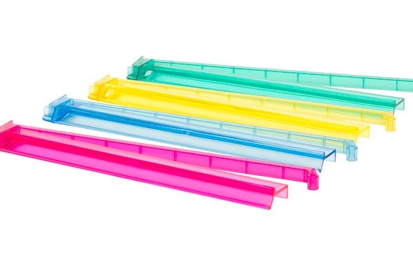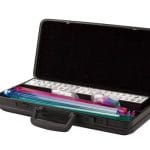 Black hard case Mah Jong set with white tiles, and racks and pusher set. Tiles comes in plastic trays.