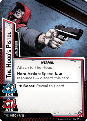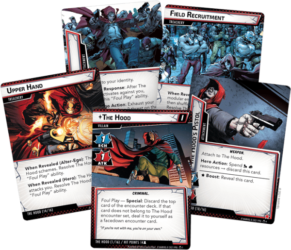 Even when he isn’t building up his criminal organization, the Hood is still a formidable threat in his own right. Armed with his two Pistols (The Hood, 9), the Hood can easily dish out enough damage and threat to keep heroes on the defensive, and his Mantle (The Hood, 8) can protect him from the heroes’ attempts to slow his momentum. Once he has the Upper Hand (The Hood, 13), the Hood will call in his new supervillain friends to make things even more difficult for the heroes—you’ll have to stay on your toes to keep yourselves from being overwhelmed!